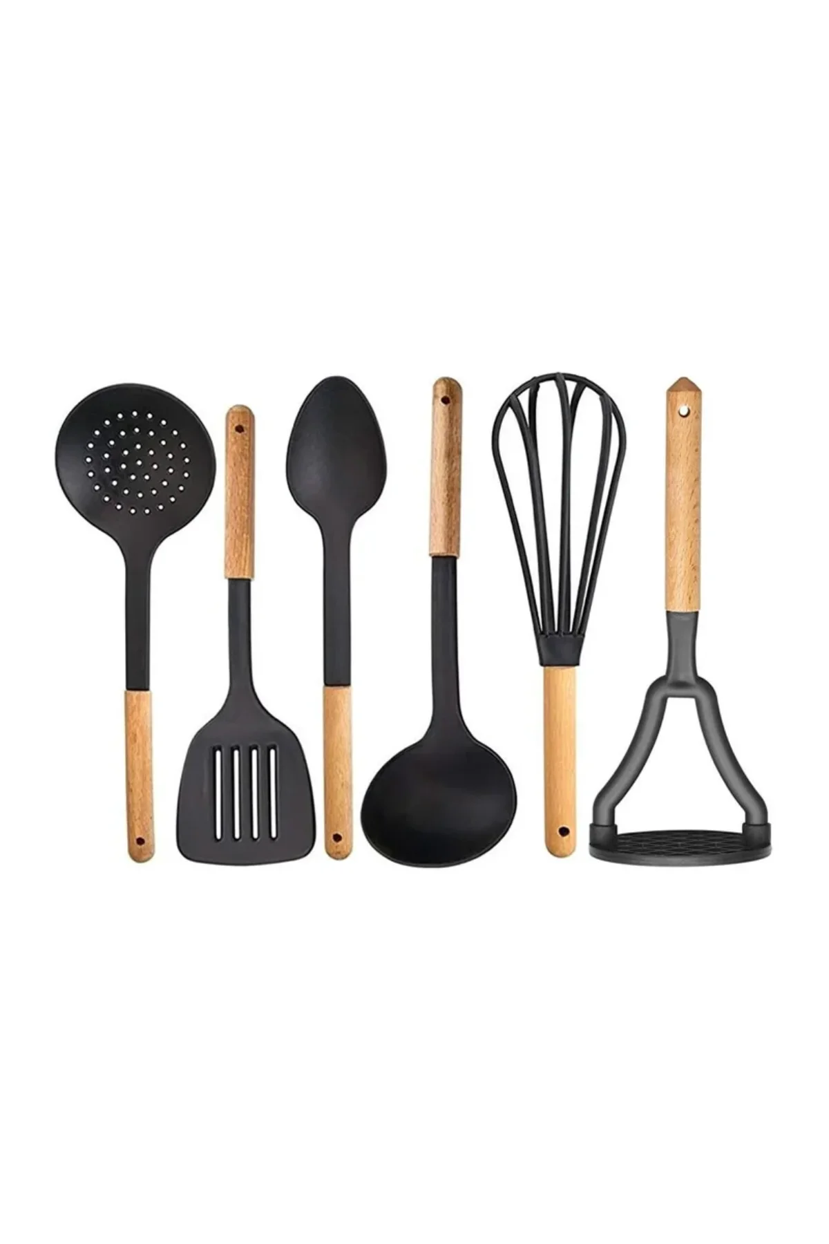 | 6 Adet Ahşap Saplı Sert Plastik Mutfak Seti 1x Kevgir 1x Spatula 1x Kaşık 1x Kepçe 1x Çırpıcı 1x Patates Ezici |