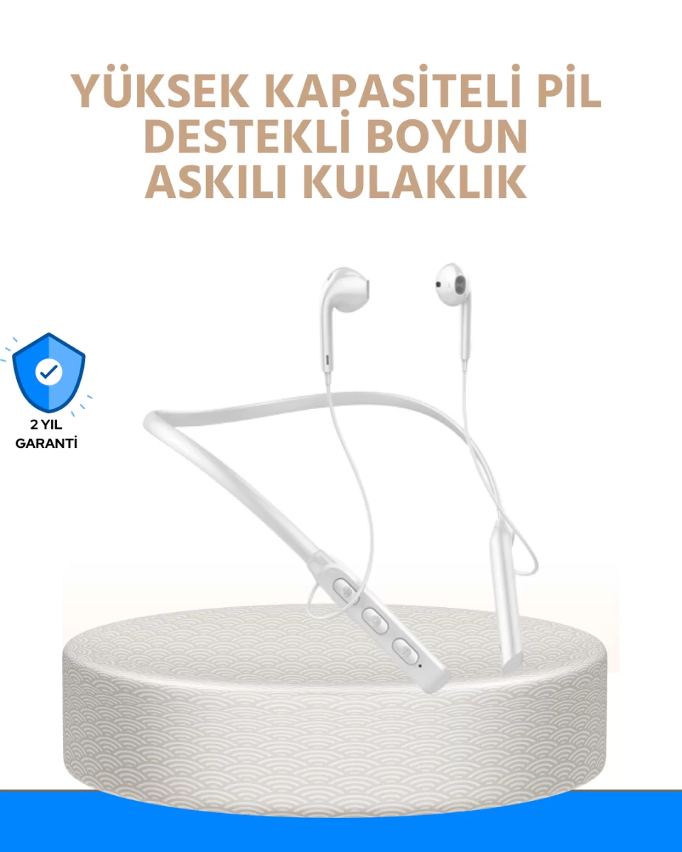 Uzun pil ömrü ve dayanıklı yapısıyla öne çıkan bu kablosuz kulaklık, 100 saate kadar kesintisiz müzik dinleme veya konuşma imkânı sunar. Boyun askılı tasarımı sayesinde spor yaparken, yürüyüşte veya günlük aktivitelerde kulaktan düşmez ve rahat bir kullanım sağlar. Bluetooth bağlantısı sayesinde akıllı telefon, tablet veya bilgisayarlarla kolayca eşleşir. Ses kalitesi dengeli olup güçlü baslar ve net tizlerle profesyonel bir ses deneyimi sunar. Ergonomik kulaklık uçları kulağa tam oturur ve dış ortam seslerini azaltarak odaklanmayı kolaylaştırır. Kullanılmadığında manyetik başlıklar sayesinde kulaklık uçları birbirine sabitlenir ve kaybolma riski ortadan kalkar. Hafif yapısı, boyunda veya çantada rahat taşınabilmesini sağlar. USB üzerinden kolayca şarj edilebilen cihaz, uzun vadeli kullanım için güçlü bir çözümdür. Gerek spor gerek iş hayatında güvenle tercih edebileceğiniz pratik bir kulaklık modelidir.