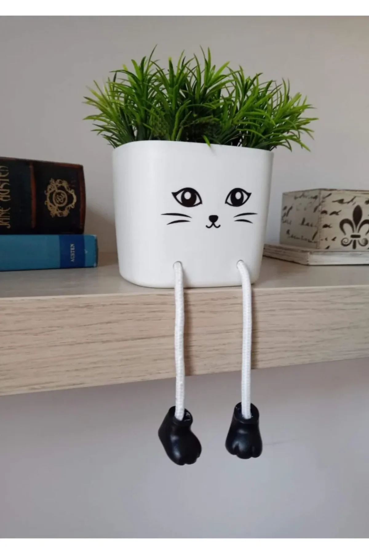 Sallanan Ayaklı Kedicik Saksıda Yapay Çiçek Beyaz